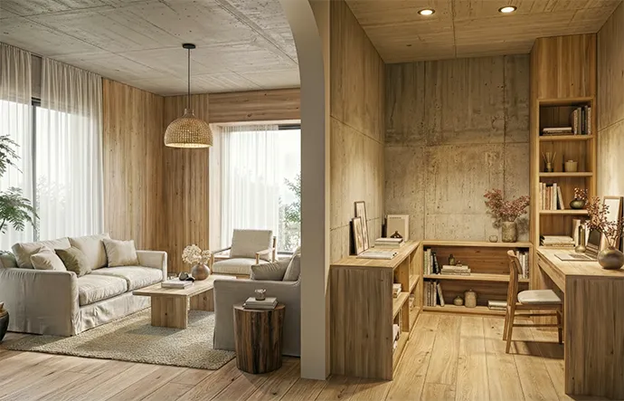 会社を経営されているご夫婦を想定し、ゲストを迎え入れる洗練された場と、心を整えるプライベート空間の両立性をコンセプトに設定。仕事の場として集中でき、夜はふたりが静かに過ごす、そんな“メリハリある暮らし”をイメージしてデザインへ。オンライン会議・対面打合せ・ゲストの滞在など、ビジネスシーンにも対応できる設計と、夫婦でリフレッシュや自己研鑽ができるスペース。“仕事の質を高める環境”と“ゲストを迎えるパブリックスペース”を兼ね備えたリノベーションアイデアです。