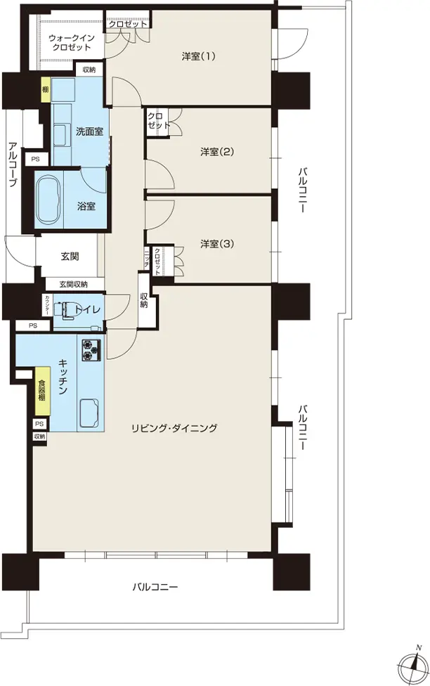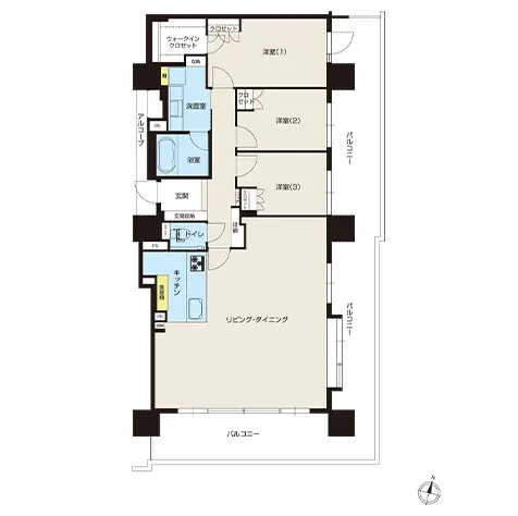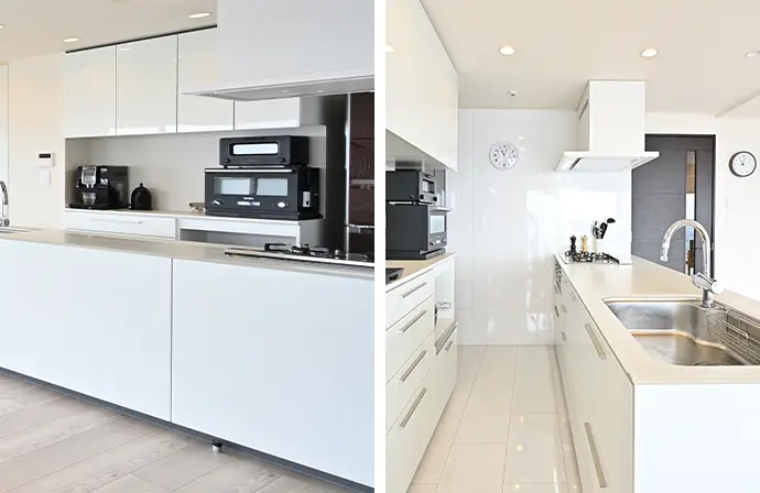 洋室(3)のリビング・ダイニング側にあったクロゼットとデスクをなくし、リビング・ダイニングを広げました。また、独立型のキッチンをオープンキッチンにすることで、さらに広がりのある空間を実現しました。床には明るいオーク柄のフローリングを採用し、白いクロスと組み合わせて開放的な空間を演出。リビング・ダイニング全体を快適に温めるよう、床暖房の設置範囲を広げました。