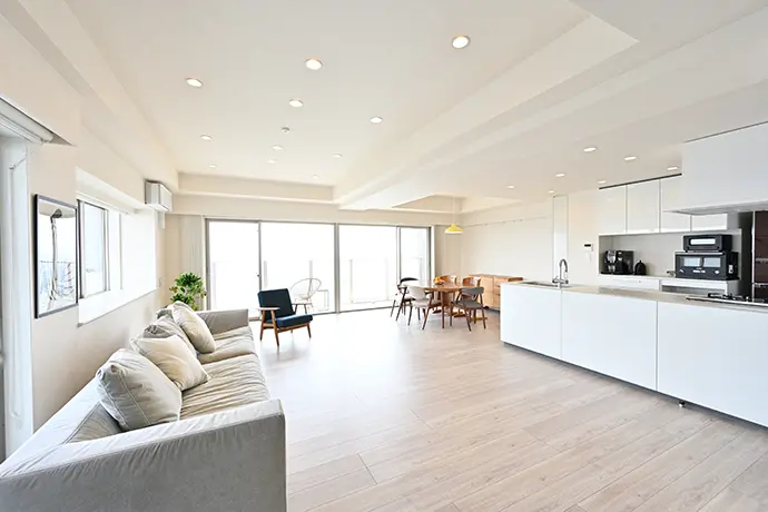 Sさまは、ご夫妻とお子さま3人の5人家族。こちらのマンションには新築時から賃貸で入居され、周辺の環境や居住者同士のコミュニケーションも良好なことから、大変気に入っていたお住まいでした。お子さまの成長に伴い、大きなリビング・ダイニングがあり、広い子ども部屋が確保できる家に移りたいとお考えでしたが、棟内で条件に合った売却物件が出たことから、お住み替えに。その後、せっかくならリビングをさらに快適にし、設備やインテリアも気に入ったものに変えたいと、リフォームのご相談をいただきました。そこで、既存の建具など生かせるものはそのままに、住み心地を高めるリフォームをご提案。キッチンはオープンキッチンに変更し、また、各々の洋室はお子さまたちが快適に過ごせるお部屋に整えました。家族のつながりを大切にしつつ、それぞれが自分の時間を過ごせる、心地よい住まいが完成しました。