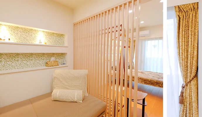 ダイニング・キッチンの壁に造作でニッチ(飾り棚)を設け、空間のアクセントにしました。洋室に設置したオーダーカーテン(画像右)と同じデザイナーのクロスに間接照明を組み合わせ、統一感のある空間を演出しました。