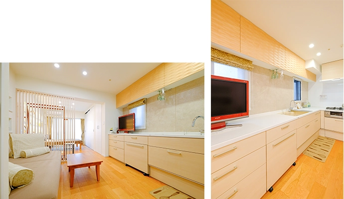 キッチンをダイニングの一部に家具のようになじませて配置。温かみのあるベージュのL字型のキッチンをご提案しました。梁はひし形模様の立体装飾パネルを張ることで、お部屋のデザイン性を高めました。ダイニングにはローテーブルを配置し、ソファに座りながら食事を楽しめる空間に。床には床暖房を設置し、冬でも快適に過ごせるよう配慮しました。さらに、キッチンカウンターのスペースをテレビ置き場として活用できるようにプランを行うことで、限られたスペースの中でも広がりを感じられる工夫を施しました。