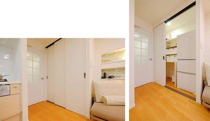 ダイニングの一角にパントリーを設け、冷蔵庫や食品類をすっきり収納できるスペースを確保しました。扉を閉めると圧迫感を与えず、空間全体がすっきりと見えます。