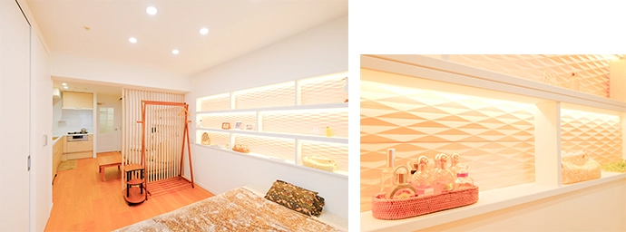 洋室の壁にも造作でニッチ(飾り棚)を設置。棚の内側の壁面はひし形模様の立体装飾パネルを張り、ナチュラルな印象に。間接照明で照らすことで、光の演出を楽しめます。床にはダイニングと同じように床暖房を設置しました。