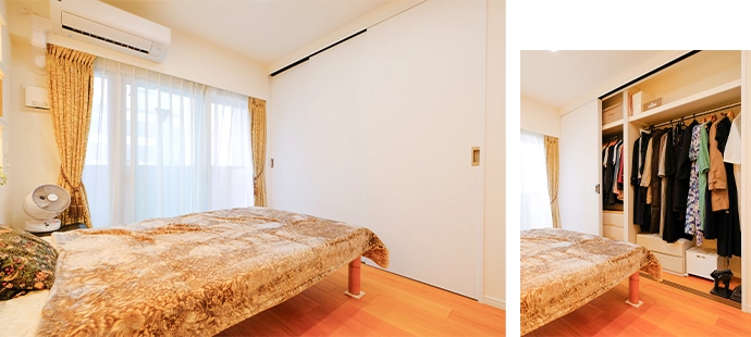 寝室として利用される洋室のクロゼットは、洋服や寝具などが無駄なく収められるように、奥行や幅を計算して設計。開けたときにベッドにぶつかることのないように、引き戸を採用しました。カーテンボックスも新たに設置し、窓には冷気の侵入を軽減するインナーサッシを取り付けて快適性を高めています。さらに、寝具やカーテンを同じシリーズのデザインでコーディネートし、統一感のある空間に仕上げました。
