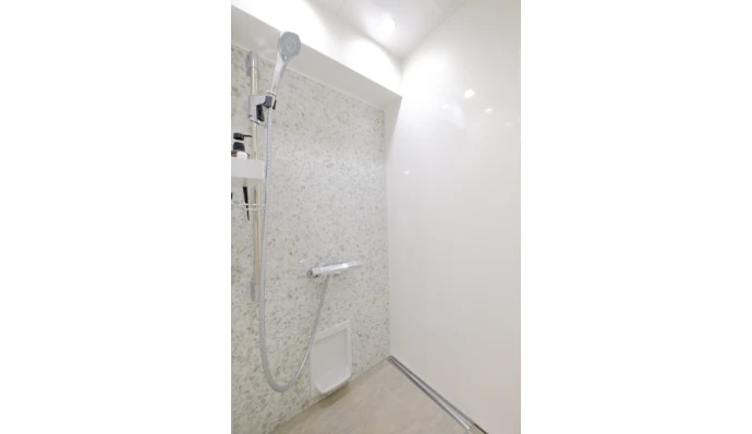 「浴槽は不要」というご要望に沿って、シャワールームを採用。余計な凸凹のない石目調のパネルでアクセントを加え、お手入れのしやすさにも配慮しました。