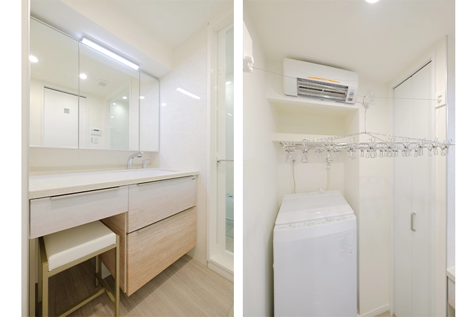 洗面室には、グラデーションが美しい扉面材を採用した洗面化粧台を設置し、カウンターには衝撃に強くメンテナンスが簡単なクオーツストーンを採用しました。壁面はメラミン化粧板で囲み、汚れがついても拭き掃除がしやすい仕様に仕上げています。また、座ったままドライヤーが使えるカウンターを設け、洗濯機前には引き出して使える物干しワイヤーを配置。加えて、洗濯機上部には洗濯物乾燥時にも活躍する電気暖房機を取り入れ、家事のしやすさと快適性を両立しました。
