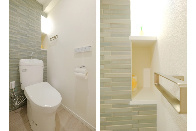限られた空間を活かすことができるように、トイレはタンクと手洗い器が一体になったタイプを採用。壁には調湿建材を張りました。オープン棚には、トイレットペーパーを隠して収納できる工夫を施しました。