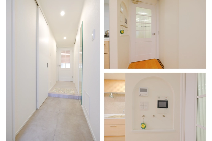 廊下からダイニングに続くドアには、アンティーク調のデザインを採用。また、インターホンの受話器の設置場所には、ラウンド型のニッチを設けて、女性らしい軽やかさを演出しました。