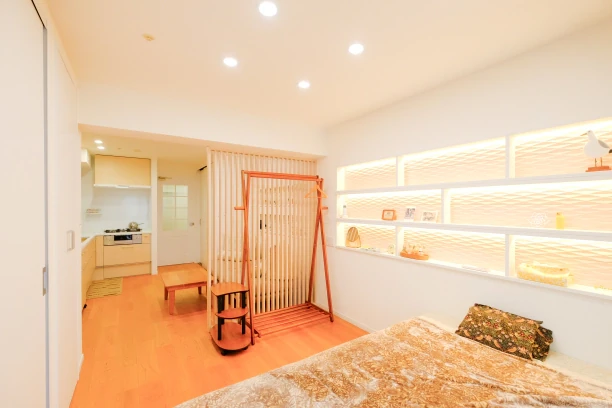 築24年の1DKのマンションに一人暮らしをされているTさま。これからも長く快適に暮らすために、内装や間取りを一新するフルリフォームを決意されました。「自分らしさを感じられる、心地よい住まいにしたい」というご要望を受け、限られた空間を有効に生かし、視覚的な広がりを重視したプランをご提案。お気に入りのインテリアに囲まれた暮らしをかなえるため、壁にニッチ(飾り棚)を造作するなど、細やかな工夫を凝らした快適な住まいに仕上げました。