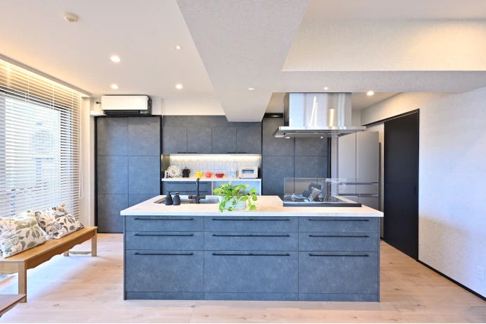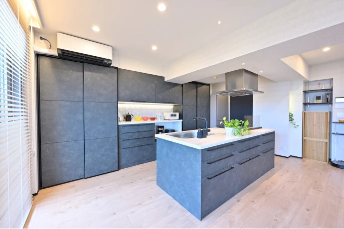 狭く、動線も限られていたクローズ型から、広々とした明るいオープンキッチンに変更。作業スペースを広く取ったアイランド型とすることで、お客さまをお招きしてのパーティなどの際にも、存分にご趣味の料理の腕をふるうことができるようになりました。収納力を高めるため、キッチン背面には梁の高さに合わせたトール型の食器棚を新設。さらに、シンクのダイニング側も収納としています。ナチュラルカラーでまとめたリビング・ダイニングに対し、キッチンの面材にはディープグリーンを採用し、統一感のある空間を演出しました。