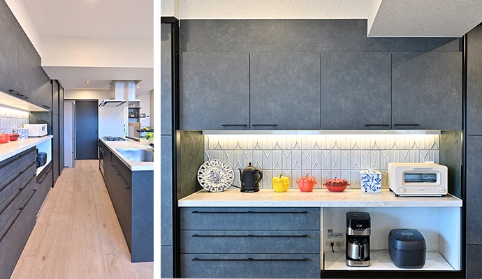 食器棚は、キッチンに合わせたディープグリーン。キッチン家電を置くための棚やお気に入りの食器などを並べられるカウンターもあります。カウンターの背面には、アクセントとしてクラシカルなデザインのタイルと間接照明を採用しました。