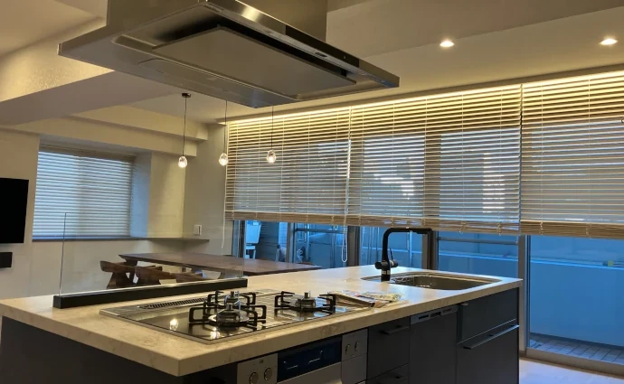 リビング・ダイニングの窓には、暖かみのある木製のブラインドを採用。外から差し込む光を調節できるブラインドと、上部に設置した間接照明が相まって、陰影のある空間を演出しています。