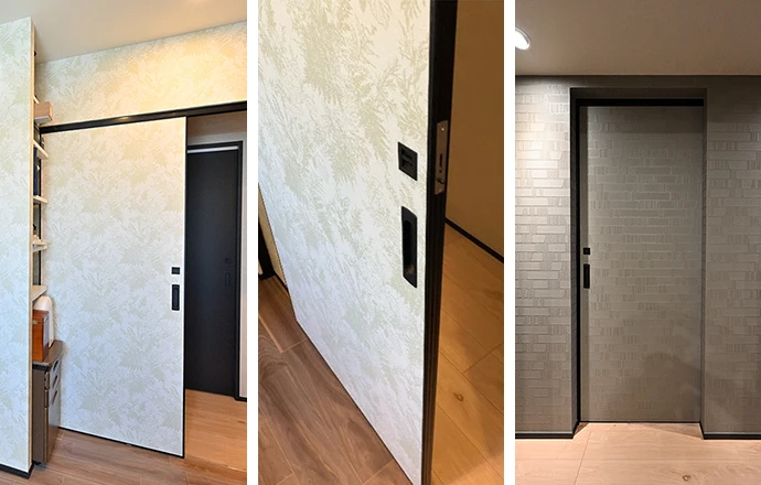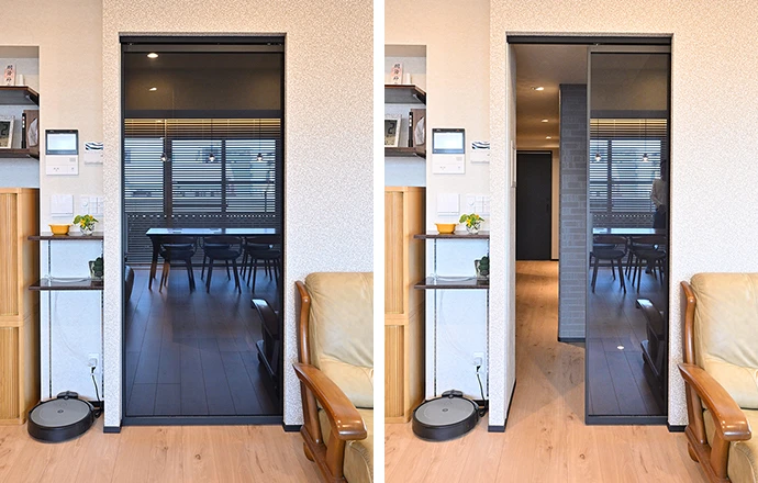 リビング・ダイニングと廊下の仕切りには、ガラス素材の引き込み戸をご提案しました。黒く着色された透明なガラスなので、適度な目隠しとなり、クロスに対するアクセントにもなっています。