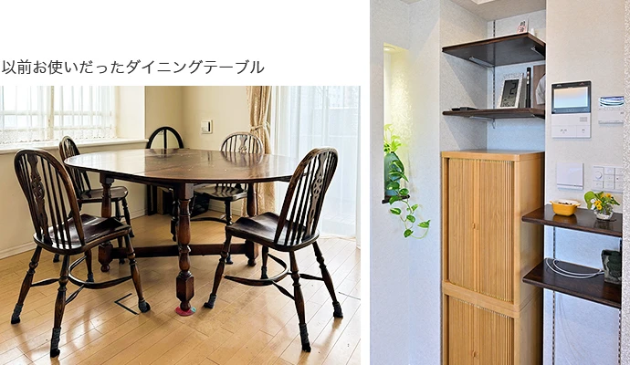 リビングの一角には、仏壇を安置するためのスペースや可動棚、ニッチ(飾り棚)を設けました。棚板には、これまでお使いだった愛着のあるダイニングテーブルの天板を加工して再使用。懐かしい記憶を留めた場所を造ることができました。