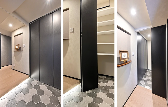 玄関は、床にハニカム型の石目タイルを張り、上がり框に間接照明を仕込むことで、モダンな空間を演出。奥行きのある玄関収納を設置することで、ゴルフバッグなども手軽に収納できるようにしました。また、玄関と廊下の間には引き込み戸を設置し、冬場の冷気が廊下に入らないよう配慮しました。さらに、廊下には視覚的なポイントとして、お気に入りの絵画などを置けるニッチ(飾り棚)を新設しました。こちらの棚板にも、以前ご愛用だったダイニングテーブルを加工して再利用しています。