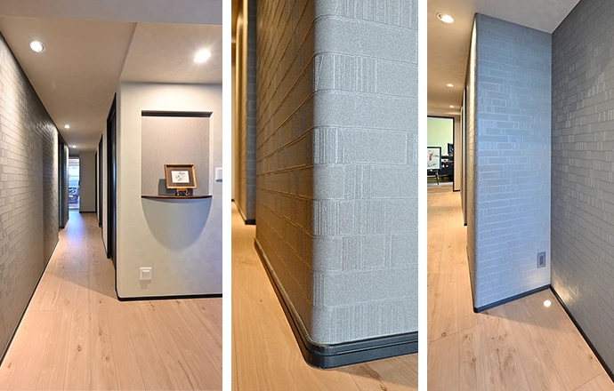 廊下は、玄関や洗面室、キッチンなどに十分な収納スペースを確保するため、位置を変更しました。同時に玄関からの視線を遮ってリビング・ダイニングのプライバシー性を高めるため、廊下にはあえて3カ所のクランクを設けました。クランクに突き出す角部分は、すべて曲面で仕上げて圧迫感を和らげています。また、廊下のクロスは一面は白基調、一面はダークなタイル柄として切り分け、床の一部にはアップライトを埋め込むなど、空間に変化をつけてデザイン的な遊び心を演出しました。