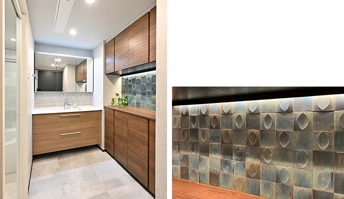 広くなった洗面室は、洗面化粧台を新しくしたほか、カウンター付きの収納を新設して、十分な収納スペースを確保しました。収納背面の壁は、青緑色のモザイクタイルを張り、さらに間接照明を設置することで、アクセントとしています。床はトイレと共通の石目調CFシートを採用。電動で昇降し、使わないときは天井に収納できる室内物干しも新設しました。