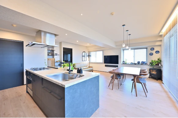 リビング・ダイニングは、和室をなくし、クローズ型からアイランド型に変えたキッチンと一続きにすることで、広々とした空間へと生まれ変わりました。白系のクロスと明るい色合いのフローリングというナチュラルな組み合わせを基調としています。
