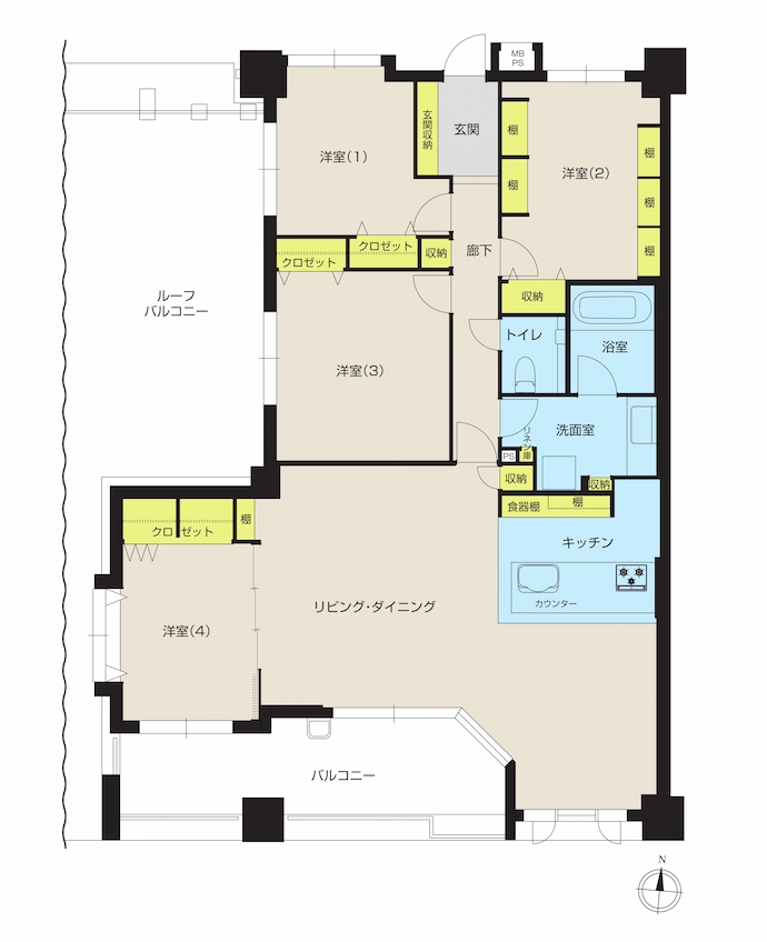 - 洋室収納、リビング収納、洗面室収納、食器棚