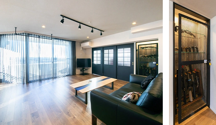 リビングの可動間仕切り建具は、お部屋全体の雰囲気に調和するダークネイビーを採用。さらに、リビングの一角には、趣味のグッズをスタイリッシュに収納・展示できるディスプレイスペースを新設。メッシュドアを用いることで、程よく視線を通しつつ、インテリアのアクセントにもなる空間に仕上げました。