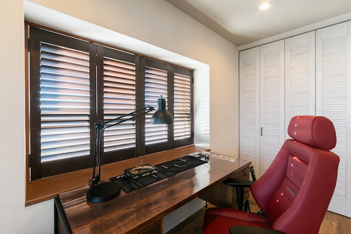 洋室(4)は、和室から洋室へと変更しました。間仕切りの引き戸を開けるとリビングとつながる空間のため、全体のインテリアとテイストを揃えました。西日が入る窓には、光量を調整できるウッドシャッターを採用。やわらかな光を取り込みながら、時間帯や用途に合わせて快適に過ごせる工夫を施しました。また、収納の扉もシャッターに合わせたルーバー仕様とし、デザイン性と通気性を兼ね備えています。仕事や作業部屋としても使いやすい、落ち着いた多目的空間に仕上げました。