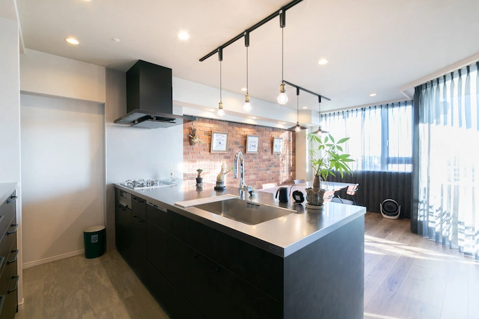 壁を取り払い、キッチンは開放感のあるオープンスタイルへと刷新しました。ダイニングとのつながりが生まれ、空間全体に一体感と広がりを感じられる構成となっています。天板にはステンレスを採用し、扉材には程よい錆感のある素材をセレクト。無機質な素材感の中にも味わい深さを感じられるよう、空間の雰囲気に調和する素材選びを心がけました。