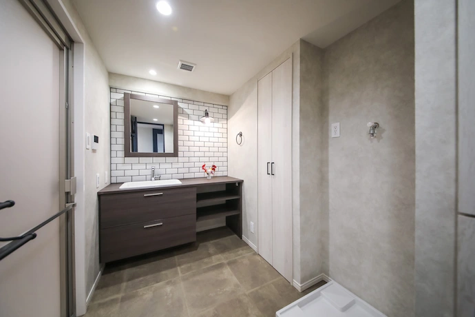 洗面室はメトロタイルを壁面に採用し、素材の質感が映える空間に仕上げました。ヴィンテージ感のあるブラケット照明を組み合わせることで、こだわりの空間になりました。