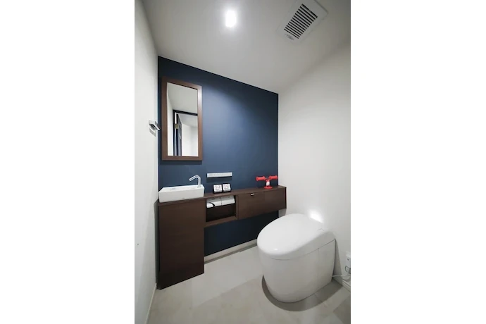 トイレはダークブルーのアクセントクロスを採用し、収納にはダークブラウンを組み合わせました。深みのあるブルーと重厚感のあるブラウンが調和し、空間全体に引き締まった印象をもたせています。色数を抑えた配色とすることで、シックで落ち着きのある、洗練されたトイレ空間に仕上げました。