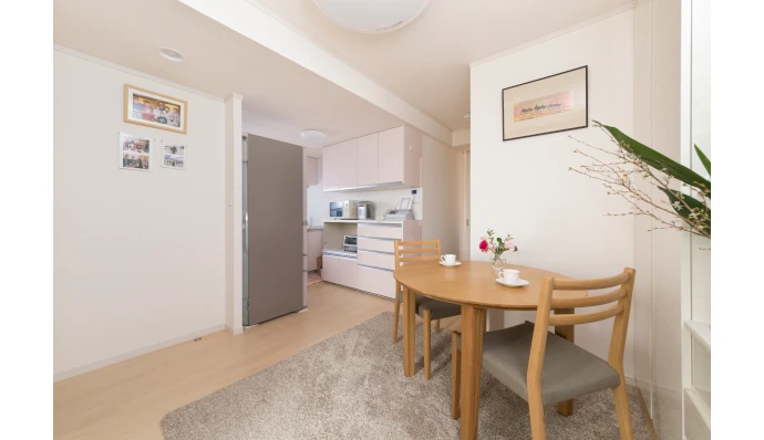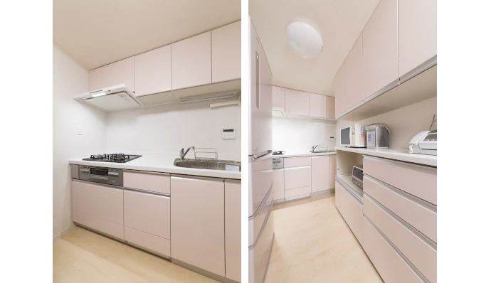 壁付け型のキッチンは、食器棚を新設することで、豊富な収納を確保。食器棚のカウンターは、調理器具などを使いやすい位置におくことができます。面材は薄いピンクで統一し、明るく華やかな空間としました。