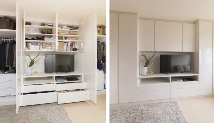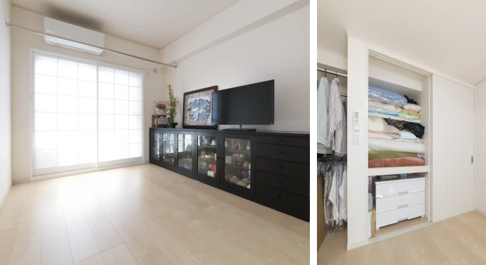 リビング・ダイニングの壁面には、テレビが置ける大容量の収納を造作。洋服たんすに入れてあった衣類も、テレビ両脇のクロゼットに収納できます(左写真)。収納を閉じれば、すっきりとした白い壁面に(右写真)。空間にゆとりが感じられるよう、テレビ上部の収納は奥行きを15cm浅くしています。