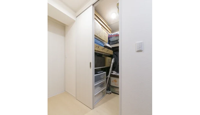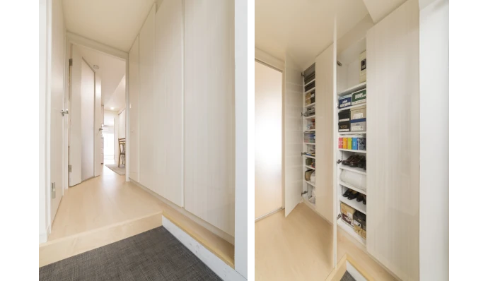 リビング・ダイニングから出入りできる、使い勝手のよいウォークインクロゼットを新設。可動棚を設置し、掃除機などの大きなものから衣類、小物まで効率よく収納できるようにしました。