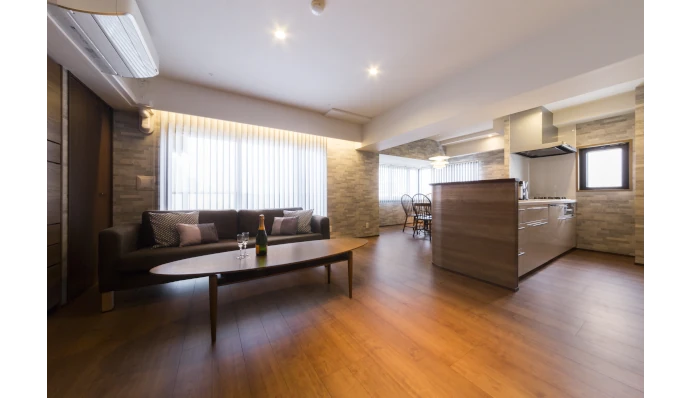 キッチンはオープンキッチンに変更し、元々の洋室をダイニングスペースとして活⽤しました。カーテンボックスに収めた間接照明と天井のダウンライトが柔らかな光を放ち、落ち着いた雰囲気を演出。⾷事の時間もより⼼地よく過ごせる、温かみのある空間に仕上げました。