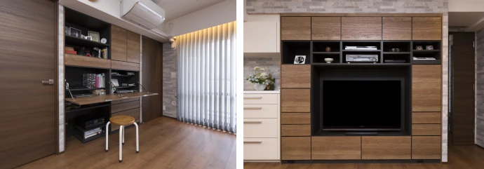 リビングには2カ所の壁⾯収納を設置しました。⼀つは開閉式のパソコンスペースを組み込みました。使わないときはスッキリ収納でき、書類や⼩物の整理もしやすい設計です。もう⼀つの壁⾯収納はソファの正⾯に配置し、テレビを設置できる仕様に。リラックスしながら映像を楽しめる空間を確保しつつ、収納⼒も兼ね備えています。収納⼒と機能性を両⽴させることで、リビング全体が整然とした印象になり、快適で使いやすい住空間を実現しました。