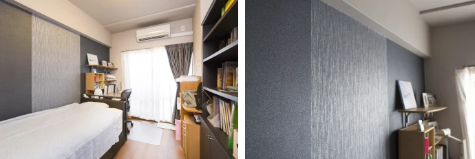 洋室(2)はお⼦さまのご要望で、壁⾯をダークトーンのアクセントクロスで落ち着いた印象に仕上げました。