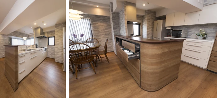 キッチンの角は緩やかなカーブを施し、ダイニングへの動線をスムーズに。さらに、引き出しと統⼀感を持たせるために、同じ⾯材のシートを張り、洗練されたデザインに仕上げることで、機能性と美しさを兼ね備えました。
