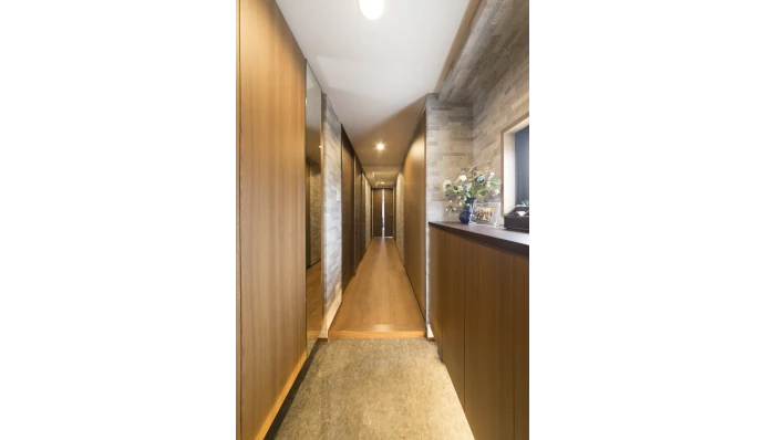 ⽞関では、ご主⼈さまとお⼦さまの⼤きな靴を収納しきれず、スペース不⾜にお困りでした。そこで奥⾏きのある壁⾯収納を新たに設けることで、靴をすっきりと収められるようになりました。