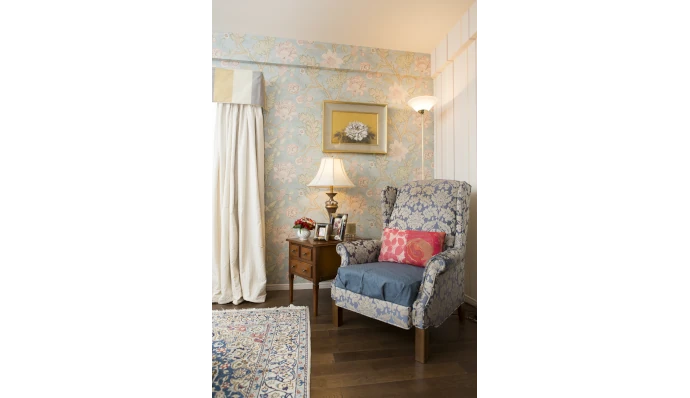 リビング・ダイニングは花柄の輸⼊クロスを使⽤しました。奥さまがセレクトされた絵の額装と調和するカラーで、カーテン上部に装飾「カーテンバランス」を取り付けました。カーテンの上部に取り付ける装飾、「カーテンバランス」を取り付けました。