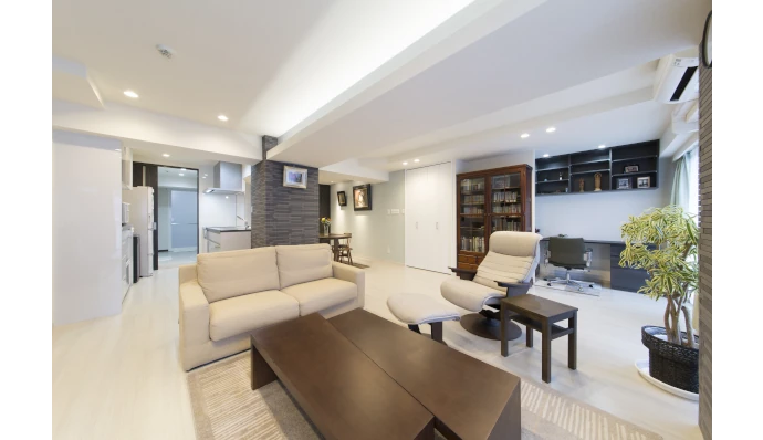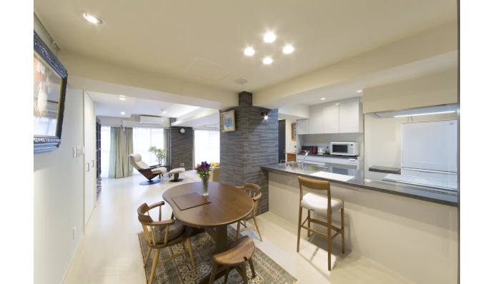 以前は梁の下に間仕切り壁があり、圧迫感のあったリビングも3つの洋室を⼀続きにした1LDKに変更し、ゆとりある広さを確保。取り除くことができなかった構造柱はタイル張りにし、上質なアクセントに。