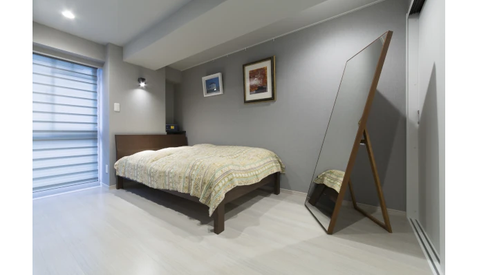 リビング横にある洋室の壁には、やわらかなグレーを採⽤し、落ち着きのある雰囲気に。壁⾯のブラケット照明は角度調整が可能で、読書灯としても活躍します。さらに、ヘッドボードの奥にはデッドスペースを活⽤して時計や⼩物を置ける⼩さな棚を設け、空間の効率化と実⽤性を兼ね備えた就寝スペースとなっています。