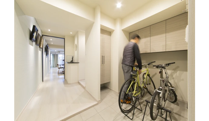 ⽞関⼟間には⾃転⾞スタンドを設置し、⼤切な⾃転⾞をスムーズに出し⼊れ可能に。上部には吊⼾棚を設け、⾃転⾞⽤品や登⼭道具などのアウトドア⽤品を整理収納できるようにしました。趣味を楽しめる、機能的かつ美しい⽞関空間となりました。