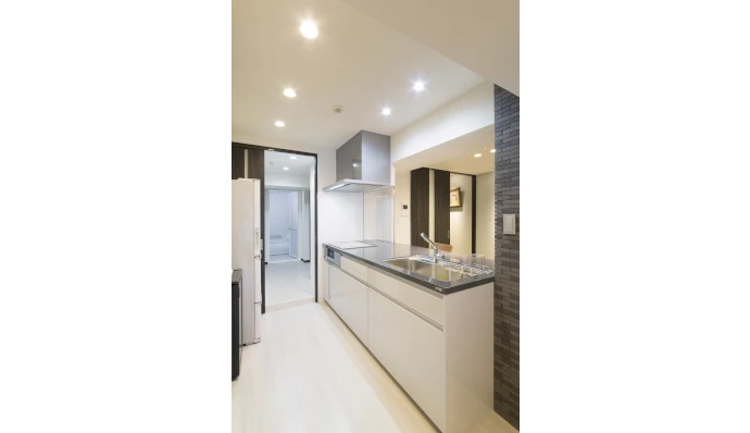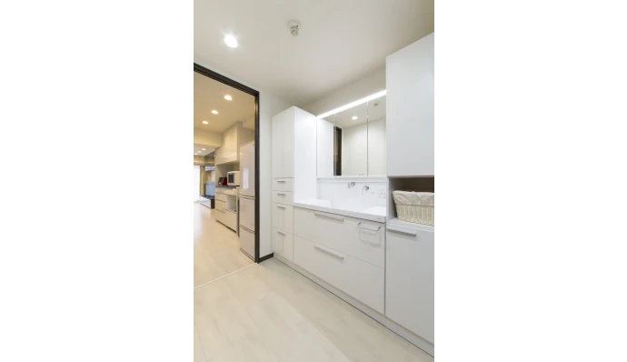 キッチン、洗⾯化粧台の位置を変更することで広がったスペースには収納⼒に優れた洗⾯化粧台を設置。⽞関から洗⾯室を経由してキッチンへとつながる動線が確保され、毎⽇の⾝⽀度や家事もよりスムーズに。