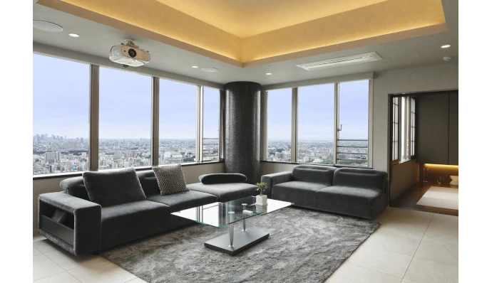居心地のよいリビング。折り上げ天井に施された間接照明が柔らかな光で包み込みます。さらに、天井にはプロジェクターとスピーカーを配置し、本格的なホームシアターを楽しめる仕様になっています。