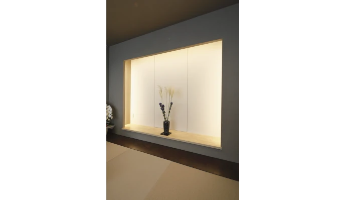 2つの居室をつなげて広々とした和室へと変更。壁面には飾り棚を造作し、間接照明が照らす、落ち着いた雰囲気を生み出しています。