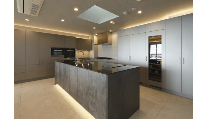 キッチンには大容量の収納スペースを新設。アイランド型のⅡ型キッチンへ変更し、作業効率を向上。さらに、天板やカウンター側面のカラーを落ち着いたモノトーンで統一しました。