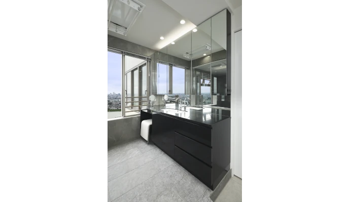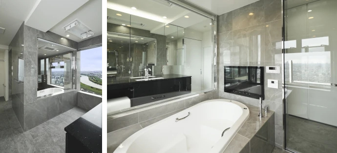 浴室は眺望を最大限に楽しめるよう、バスタブの位置を変更しました。さらに、大きなガラスの仕切り窓を設けることで、開放感あふれる空間となりました。
