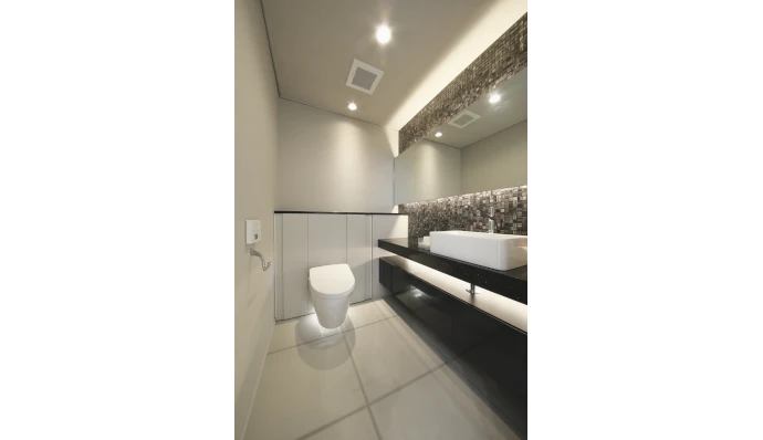 ゲスト用トイレにはフロートタイプを採用し、お手入れがしやすい設計に。幅広のミラーを設置し、壁面には空間のアクセントとしてタイルを施しました。さらに、間接照明を加えることで、洗練された雰囲気を演出しています。